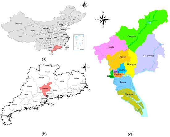 Location maps; (a) the location of Guangdong Province in China; (b) the location of Guangzhou in Guangdong Province; (c) the administrative division map of Guangzhou.