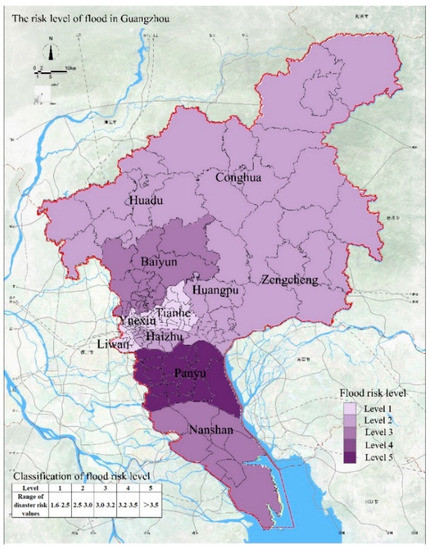 Guangzhou is an area that experiences frequent natural disasters. According to the relevant statistics, from 1949 to 2015, there were 21 floods in Guangzhou and seven floods in the basin. The basin floods caused different degrees of loss and threatened the development of Guangzhou. Based on the indicators and weight values of flood disasters, we obtain the assessment results of flood disaster risk in Guangzhou (see as Figure 2). We determined that the area with the highest flood risk is Panyu District and the areas with the lowest risks are Yuexiu District and Liwan District. The flood risk level in Panyu District is 5. We believe that this attributed to the low altitude in Panyu District, which results in excessive runoff. In addition, because Panyu District is close to the Pearl River estuary, the density of the water network is relatively high and the area is susceptible to water accumulation. Therefore, Panyu District has the highest flood disaster risk. The flood risk level of Nansha District is 4 and this area is also affected by the offshore estuary. The flood risk level in Huangpu District and Baiyun District is 3 and this risk level is attributed to the low density of the drainage network and the slow drainage of rainwater. The risk level of floods in Huadu District, Haizhu District, Zengcheng District, and Conghua District is 2, representing a low probability of flood disaster. The flood risk level is 1 for the Liwan District, Yuexiu District, and Tianhe District, indicating that these areas are less likely to be affected by flood disasters.
