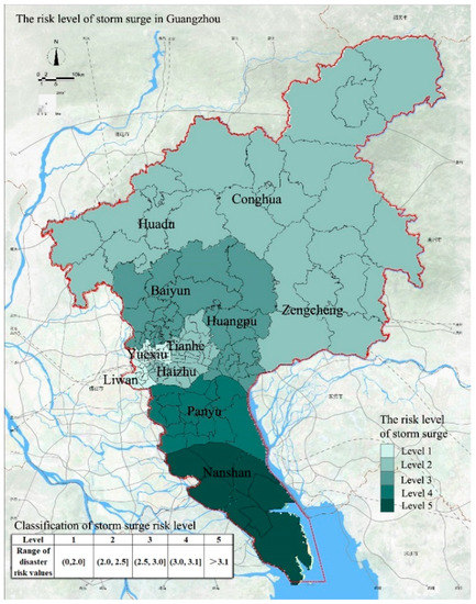 Storm surge refers to an abnormal rise and fall of the sea level due to severe atmospheric disturbances such as strong winds and sudden changes in air pressure. Because of the proximity to the estuary, the area adjacent to the estuary in Guangzhou is affected by the storm surge. At the same time, as the river system of Guangzhou is connected to the ocean, the rise of sea level will also affect the water level of urban rivers. The frequency and intensity of tropical cyclones in Guangdong Province are the highest in China. On average, 3.54 tropical cyclones occur in Guangdong Province each year, accounting for 37% of the national occurrence, and up to seven cyclones have occurred in the past. Storm surges caused by strong tropical cyclones often lead to extreme weather events such as heavy rainfall, strong winds, large waves, and seawater intrusion. These events cause large numbers of casualties and property damage. The comprehensive assessment of the storm surge risk in Guangzhou is shown in Figure 3. The area with the highest risk level of storm surge disasters in Guangzhou is Nansha District, whereas Yuexiu District and Liwan District have the lowest risk level. The storm surge risk level in Nansha District is 5. We attribute this level to the low elevation of the Nansha District that results in excessive surface runoff. When a storm surge is followed by heavy rainfall, water accumulation occurs. In addition, Nansha District is close to the estuary of the Pearl River and the area often is submerged due to high tides caused by the storm surge. Moreover, the density of the water network in the area is relatively high, making the area susceptible to the impact of seawater intrusion caused by storm surges. As a result, the risk of storm surge disasters is highest in Nansha District. The storm surge risk level in Panyu District is 4 and this is also attributed to the proximity to the estuary, resulting in a higher risk. The storm surge risk level in Baiyun District and Huangpu District is 3; these areas have relatively low drainage capacity. The storm surge risk level of Huadu District, Conghua District, Zengcheng District, Tianhe District, and Haizhu District is 2, indicating a low probability of storm surge disasters. The storm surge risk level in Liwan District and Yuexiu District is 1, indicating that these areas are not affected by storm surge disasters.