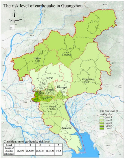 According to statistics, 20 earthquakes of magnitude 4 or higher (including 19 earthquakes with magnitude 4 or higher and one earthquake with magnitude 5) and six earthquakes with a seismic intensity equal to or greater than 5 have occurred in Guangzhou. Guangzhou City is located in the Pearl River Delta Earthquake Key Monitoring and Defense Zone and there are many fault zones in the urban area. We assessed the risk of earthquake disasters from three aspects: natural disaster intensity, seismic vulnerability, and seismic response capability. In our article, when we discuss the natural disaster intensity of an earthquake in a certain area, we mainly consider the following three points: (1) Whether there is a distribution of seismic fault zones in the area, and the distance from the earthquake fault zone; (2) Has there been an earthquake in the area? (3) Earthquake fortification intensity in the area. According to the specific situation of Guangzhou, although there are several small fault zones distributed in the city area, the geological tectonic movements are not frequent, and no earthquake has occurred in the past 100 years. At the same time, the seismic fortification intensity in most parts of Guangzhou is VII. Due to the uncertainty of the location of an earthquake, the natural disaster intensity is difficult to determine in a small area. Therefore, for the assessment of earthquake risk, we assume that the natural disaster intensity is the same in all areas of Guangzhou. Based on this premise, we discuss the relative risk of earthquake risk. Generally, we assume that the smaller the earthquake vulnerability index in a region, the greater the seismic response capability is and the lower the earthquake risk is in this region [8,9].