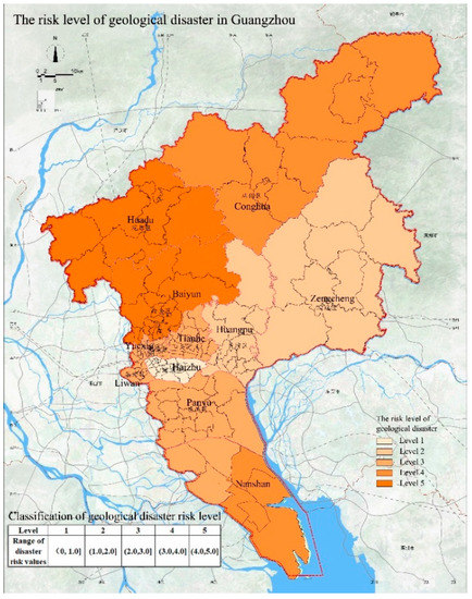 The topographic and geological conditions of Guangzhou City are relatively complex and there are many faults. In addition, due to natural environmental conditions and human engineering activities, geological disasters often occur in Guangzhou. The types of geological disasters that have occurred in Guangzhou include collapses, landslides, debris flows, ground subsidence, land subsidence, foundation settlement, and soil erosion. Among the 190 geological disasters that have occurred in Guangzhou, 39 were induced by natural factors, accounting for 20.5%, and 151 were induced by human factors, accounting for 79.5%. It is evident that human factors are the main reasons for geological disasters. The distribution of geological disasters in Guangzhou is uneven and most have occurred in Huadu District, Zengcheng District, and Conghua District (Table 3). The risk levels of geological disasters in Guangzhou are shown in Figure 5. The risk level is highest (5) in Baiyun District. This is attributed to a large number of geological hazard locations in the area (Table 3) and in addition, the area is close to many faults, which may the source of many disasters in Baiyun District. The risk level of Huadu District, Conghua District, and Nansha District is 4 and is also the result of the proximity to the faults and geological disaster locations. The risk level in Panyu District, Yuexiu District, Tianhe District, and Liwan District is 3, representing a medium risk level, which is also related to the geological disaster locations in these areas. The risk level in Huangpu District and Zengcheng District is 2. There were fewer geological disasters in these two regions, resulting in a lower risk level. The risk level of geological disasters in Haizhu District is 1, indicating that this area is not much affected by geological disasters.