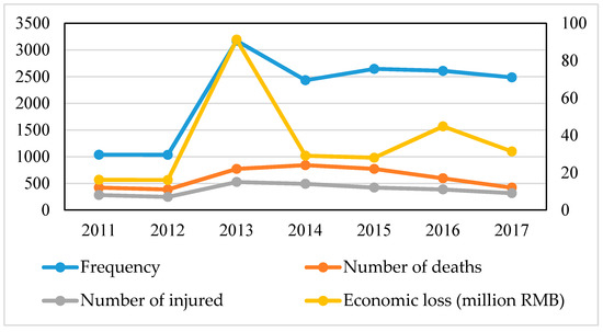 China has a large population and a complex natural environment. It suffers the highest number of disasters and the most serious disasters. The estimated annual economic losses caused by disasters in China range from 150 billion CNY to 250 billion CNY [8]. Various types of disasters that have occurred in the past 10 years, such as the Wenchuan earthquake in 2008, the Yushu earthquake in 2010, the Zhouqu mudslide in 2010, the Shanghai Bund stampede in 2014, super typhoon Moranti in 2016, the Sichuan mountain collapse in 2017, and the torrential rains of 2018 have all caused serious losses to people’s lives and productivity. At present, China is in a period of rapid urbanization. An increasing number of people are moving into cities. On the one hand, this has resulted in the prosperity and development of cities. On the other hand, it has also caused large impacts on cities, making them more fragile. In the face of various natural disasters and man-made disasters, cities often exhibit great vulnerability, which becomes a bottleneck that restricts urban survival and sustainable development. Therefore, it is necessary to clearly understand the current situation of disaster risks faced by cities in the process of urbanization and to assess the disaster risks faced by cities. Countermeasures for urban adaptation to disaster risks have been proposed to improve a city’s ability to respond to disasters and achieve sustainable urban development [9]. The objective of this study is to explore the methods of urban disaster risk assessment and put forward strategies for urban adaptations to the disaster risk environment.