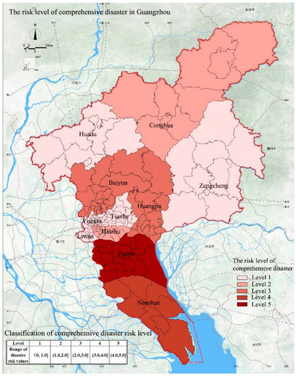 The risk levels of comprehensive disaster in Guangzhou.