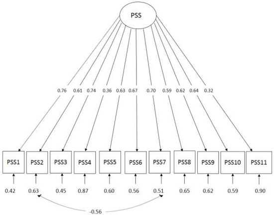 Path diagram of PSS-M confirmatory factor analysis (CFA), which indicates the interaction between items 7 and 2.