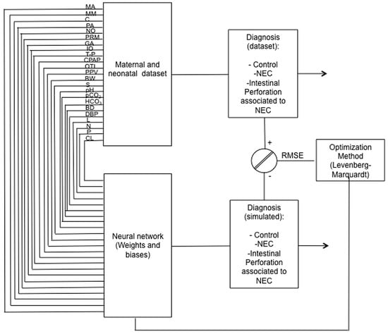 The architecture of ANN models comprised three layers of neurons (nodes) connected together: an input layer (parameters predicting the outcome), a hidden layer (activation transfer functions) and an output layer: the prediction of diagnosis, either (1) no NEC nor IP, (2) NEC or (3) IP associated with NEC. The database (N = 76 neonates) was randomly divided into training (80%) and testing, validation (20%). The input variables were normalized in the range of 0.1 to 0.9, as previously described [26], in order to prevent within-patient differences in variation and amplitude among variables, and the output variable was not normalized. The Back-propagation neural network (BPNN) was used to train and test ANN models using the Levenberg-Marquardt algorithm [30], as previously explained [26,27]. Briefly, in the hidden layer, one to <5 neurons were applied until the Root Mean Square Error (RMSE) between the experimental data (Target) and predicted values (network) was <10−12, as well as validation of the model by the slope and intercept statistical test (see Section 2.3.3) and avoiding overfitting (performance evaluation of the model through training, testing, and validation).