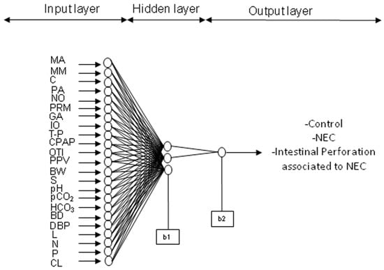 This work was designed to forecast IP related to NEC and to investigate the predictive quality of variables. For this purpose, we developed two estimation models for intestinal perforation associated with NEC: (a) an ANN model at birth and (b) an ANN model at birth and during hospitalization. Three groups of neonates were compared: (1) control group without NEC nor intestinal perforation but with similar gestational age (N = 27), (2) NEC group (according to Bell’s staging criteria) (N = 23) and (3) Intestinal perforation associated with NEC group (Bell’s Stage IIIB) (N = 26). We excluded 15 cases with incomplete clinical information as well as spontaneous or not associated with NEC intestinal perforation, as well as digestive tract malformations. Control neonates were not stage I NEC (or any NEC stage). We carefully collected a balanced dataset with a similar number of samples per group.