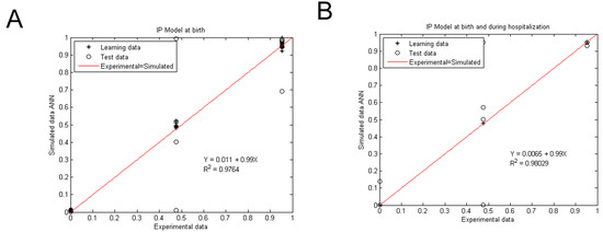 Experimental vs. ANN-simulated values for IP diagnosis estimation. Scatter plot of IP model at birth (A) and at birth and during hospitalization (B). Red lines indicate the linear regression model on scatter points. Open circles and closed diamonds show experimental and learning data, respectively.