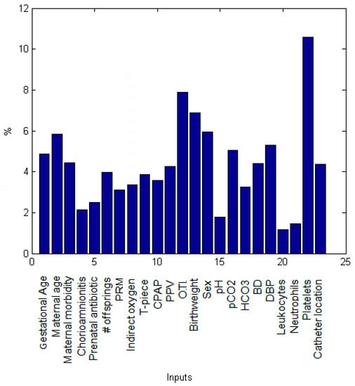 Twenty-three input variables were chosen from the entire database with the following maternal parameters: maternal age (MA), maternal morbidity (MM, see list in Appendix A), chorioamnionitis (C, y/n), prenatal antibiotic (PA, y/n), number of offsprings, Premature rupture of membranes (PRM, y/n), and neonatal variables at birth: gestational age (GA), oxygen therapy at birth (y/n): indirect oxygen (IO, y/n) T-piece (T-P, y/n), Continuous positive airway pressure (CPAP, y/n), positive pressure ventilation cycles (PPV, y/n), orotracheal intubation (OTI, y/n), birth weight (BW), sex (S), arterial pH (pH), blood gas: CO2 (pCO2), HCO3, base deficit (BD), diastolic arterial blood pressure (DBP), number of total leukocytes (L), neutrophils (N), platelets (P), and catheter location (CL). Input variables range is shown in Table 3.