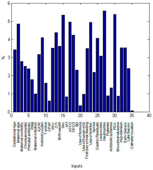 In order to identify key factors that play an important role in predicting intestinal perforation associated with NEC, we performed a sensitivity analysis to the trained and validated neural network, as previously described ([26,27] and Garson algorithm in Appendix B), allowing to determine which input variables (maternal and neonatal parameters) are more important (or sensible) to attain precise output values (diagnosis).