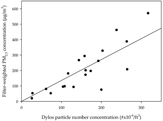 Comparison of the particle number concentration (#×10−4/ft3) determined using the Dylos DC1700 and the filter-weighted PM2.5 concentration (μg/m3) determined using the MicroPEM.