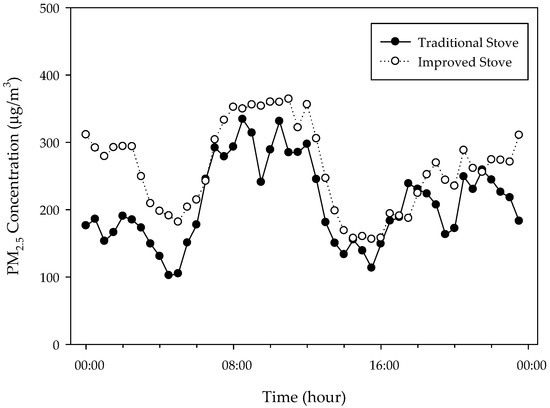 The purpose of this study was to determine the characteristics of indoor PM2.5 concentrations by measuring the 24 h profile of indoor PM2.5 concentration in gers using traditional and improved stoves. Concentrations were measured using a particle counter that was calibrated with a collocated real-time light scattering monitor adjusted by gravimetric measurement.
