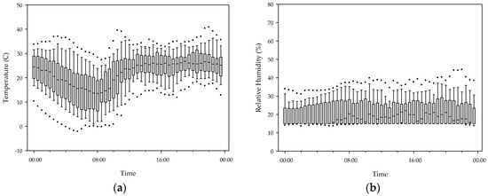 (a) Temperature and (b) relative humidity in 55 gers; outliers are beyond the 5th and 95th percentiles.