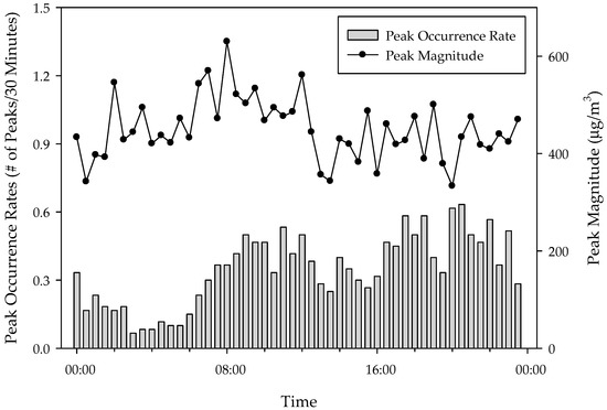Figure 5 shows the temporal profiles of the peak occurrence rate (# of peaks/30 min) and peak magnitude (μg/m3) in 60 gers. The peak occurrence rate increased at 6:00 a.m. and again at 6:00 p.m. after a slight downturn in the afternoon. More peaks were observed in the evening, while fewer peaks were observed during the night. The peak occurrence rate profile was similar to the 24 h profile of PM2.5 concentrations. Unlike the peak occurrence rate, the peak magnitude did not change over the 24 h.