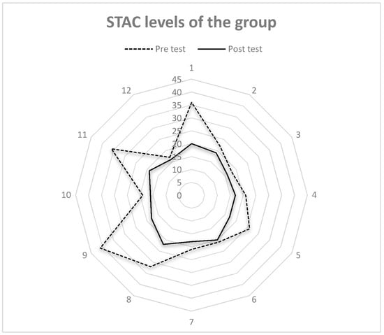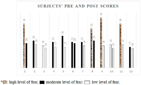 If we analyze the results at group level, as shown in Figure 3, after the intervention with the JUA program all subjects were located below the blue area, which means a low level of fear of falling (≤22 points) [].