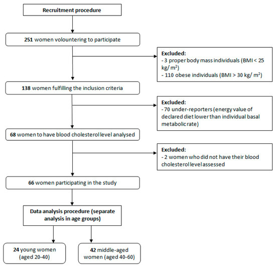 The inclusion procedure and study design are presented in Figure 1. After including participants into the study, two separate age groups were formulated—women younger than 40 (n = 24) and older than 40 (n = 42)—to compare associations observed in two groups and observe potential age-dependent relations. However, all procedures conducted in both groups were identical, and they were treated separately only in analysis. The age of 40 was chosen in order to divide the study sample into younger and older ones, as in a number of studies of cardiovascular risk, the participants aged above 40 are treated as a separate group, as they may develop cardiovascular problems even if not diagnosed [12,13]. Similarly, for the Framingham Heart Study cohort, the age group of participants older than 40 was also analyzed [14] and some authors even recommend to conduct the formal cardiovascular disease risk assessment, in the case of no risk factors, only for patients at the age of 40 or more [15].