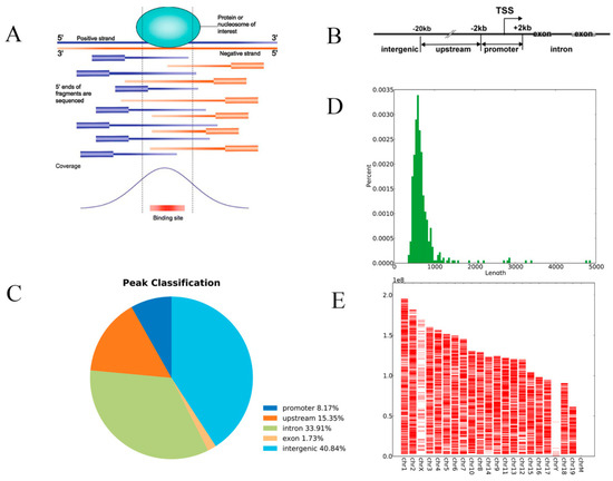 The results of chromatin immunoprecipitation sequencing (ChIP-Seq). Two samples from the low benzene (LB) group and two samples from the control group were selected. (A) Enriched peak. (B) Peak annotation. The enriched peaks were identified and classified as follows: Promoter peaks, upstream peaks, intron peaks, exon peaks, and intergenic peaks. (C) Peaks classification. Of the total generated significant peaks in the control sample (p < 0.0001), 8.17% were within the promoter region, 33.9% were within introns, and 40.84% were within the intergenic region. (D) Peak length distribution. The length distribution of the enrichment peak is calculated to infer the length of the DNA binding region. (E) ChIP-Seq peaks over chromosomes. The distribution of peaks in the genome was statistically enriched, and the chromosomes in the DNA binding region were viewed as a whole.