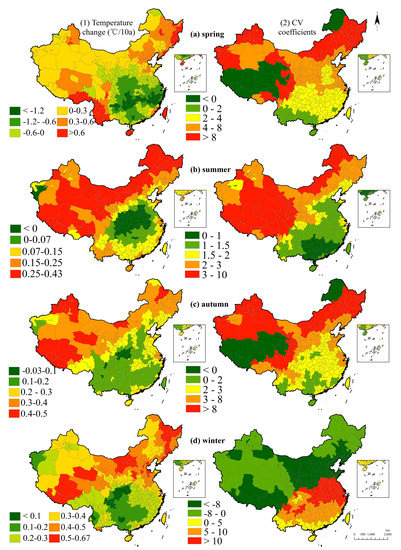 Seasonal temperature changes and fluctuations in 60 years. Note: (a1) is for the temperature change in the spring and (a2) is the CV coefficient. For the same period, (b–d) are corresponding to the temperature change and the CV coefficient in the summer, the autumn, and the winter.