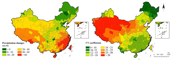 Precipitation was found to have increased in most areas during the 60 years studied. It shows that the southeast region has a progressively increased tendency and it has the fastest increase, which is followed by the Tibetan Plateau with a gradient in (4.0, 6.0). A precipitation decreasing region is mainly in Northeastern China. In the perspective of precipitation fluctuation, the narrowest margin of precipitation distributes in the southeast and northeast region and the most fiercely fluctuation appears in the northwest and the Tibetan Plateau (Figure 6).