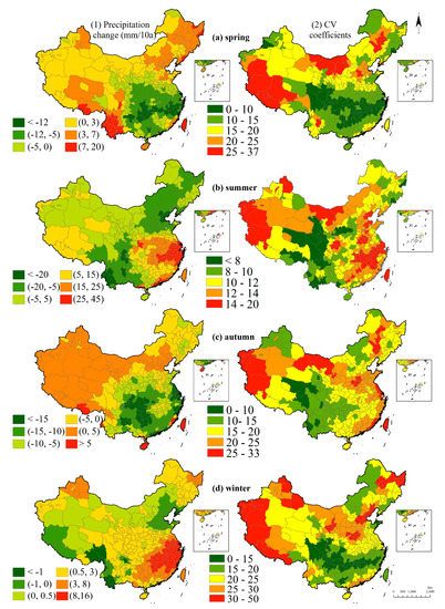 Seasonal precipitation changes and fluctuations in 60 years. Note: (a1) is for the precipitation change in the spring and (a2) is the CV coefficient. For the same outcome, (b–d) are corresponding to the precipitation change and the CV coefficient in the summer, autumn, and winter.