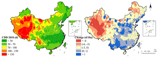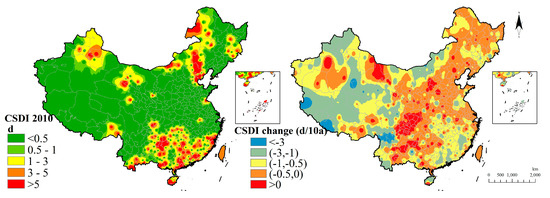 CSDI shows that the southern region owned a long cold spell duration than the northern region in 2010. As for the 60 years’ variation, most region had a decreasing CSDI and parts of the middle region with the red color were increasing in CSDI (Figure 8).