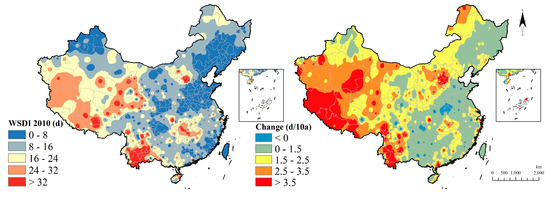 WSDI in 2010 showed that the western region had a longer duration of warming than the eastern region and the high value region is in the southwest region (Yunnan province) exceeding 24 days. Additionally, 60 years’ variation manifested that almost the entire country showed an increased tendency in the WSDI except for a few regions with the western growth being faster than the eastern and the highest value being in south Xinjiang and north Tibet, which is similar to the research of Yao [22] (Figure 9).