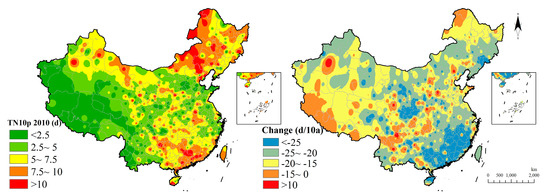 TN10p shows a spatial gradient and retains longer in the eastern region than that in the western region in 2010. It keeps more than 10 cool nights in some southeast and northeast regions. Variation in 60 years told that the cool nights indicator in just few regions of the northwest are increasing while most regions are decreasing and the highest value occurs in the southeast region. It manifests that night temperature grew a lot during the past 60 years (Figure 10).