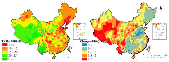 TX90p maintained that the western region has longer warm days than in the eastern region. Specifically, TX90p in the eastern region kept the values for 15–20 days while, in the western region, it is more than 20 days. In addition, the 60 years’ TX90p change showed that few regions in the middle-eastern region are decreasing and most regions have an increasing tendency. The western region increases more than in the other region (Figure 11).