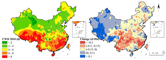 For the spatial distribution of CWD, South China and the Tibetan Plateau own the high value of CWD of more than eight days. Combined with the CDD, we can see that Tibetan Plateau is a temporally concentrated region of dry and rainy weather. The change of CWD performed a decline tendency in the southern region while having a growth trend in the Tibetan Plateau (Figure 13).