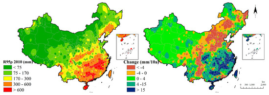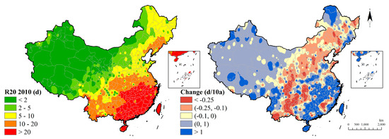 The Southern China has a high value of R20, which kept more than 20 days in 2010 while the western arid region recorded less than three days, which shows a gradient sharp from the southeast to the northwest regions. The extreme precipitation in the southern region were strengthened in 60 years and the smaller area is the red region distributed from the northeast to the southwest regions (Figure 14).