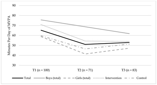 Changes in minutes per day of the accelerometer-measured moderate-to-vigorous physical activity (MVPA), between T1 (baseline, 2014) and T3 (endpoint, 2016), for the total sample, boys (total sample), and girls (total sample), and the intervention and control groups, respectively. The figure shows the mean group level of MVPA.
