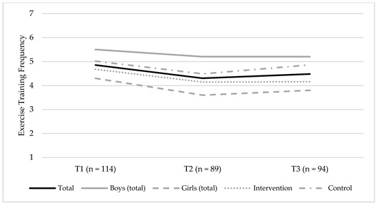 Changes in the self-reported exercise training (ET) frequency between T1 (baseline, 2014) and T3 (endpoint, 2016) for the total sample, boys (total sample) and girls (total sample), and the intervention group and control groups, respectively. The figure shows the mean group levels of ET frequency, and possible responses were coded as follows: 1 = never; 2 = less than once a month; 3 = once a month; 4 = once a week; 5 = 2–3 times a week; 6 = 4–6 times a week; and 7 = every day.
