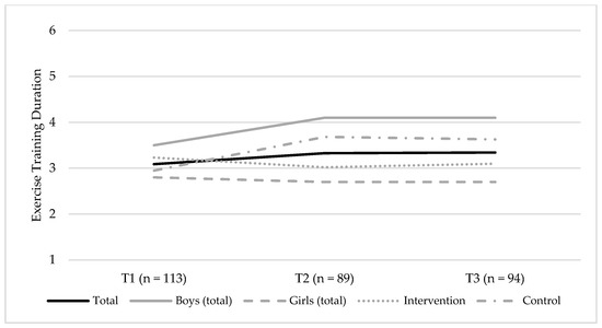 Changes in the self-reported exercise training (ET) duration, between T1 (baseline, 2014) and T3 (endpoint, 2016), for the total sample, boys (total sample), and girls (total sample), and the intervention and control groups, respectively. The figure shows the mean group levels of ET duration, and the possible responses were coded as follows: 1 = none; 2 = about 30 min; 3 = about 1 h; 4 = about 2–3 h; 5 = about 4–6 h; and 6 = about 7 h or more.
