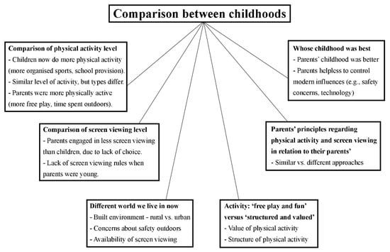 Solomon-Moore, E.; Emm-Collison, L.G.; Sebire, S.J.; Toumpakari, Z.; Thompson, J.L.; Lawlor, D.A.; Jago, R. “In my day…”- Parents’ Views on Children’s Physical Activity and Screen Viewing in Relation to Their Own Childhood. Int. J. Environ. Res. Public Health 2018, 15, 2547. https://doi.org/10.3390/ijerph15112547