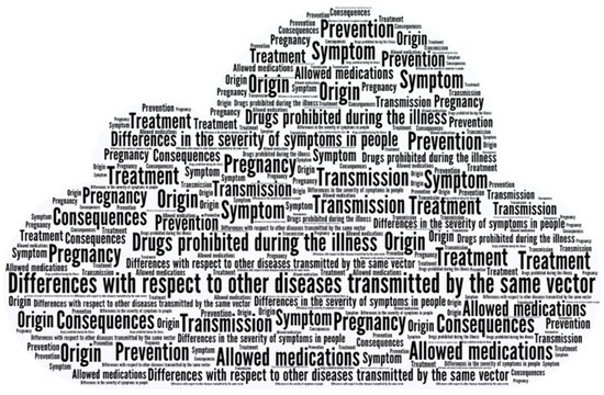In order to learn about concerns and points that are of interest to the study population, at the end of the survey, we asked this question: “What aspects do you not understand or are confusing for you about Zika?” In this regard, the responses were diverse and grouped into the following topics: treatment, consequences, transmission, and prevention of mosquito bites. Regarding treatment, people have a few queries about what medications they can or cannot take during the infection and whether there is a specific diet. As regards consequences, people have a few queries about sequelae of the infection and how to detect them. With regard to the transmission and prevention of mosquito bites, the questions were about resistance to larvicide products, whether the mosquito itself can transmit the disease, and about all of the transmission modes (Figure 1). The ten most frequently encountered answers were (1) differences with respect to other diseases transmitted by the same vector, (2) treatment, (3) transmission, (4) symptoms, (5) effect on pregnancy, (6) origin, (7) consequences, (8) drugs prohibited during the illness, (9) drugs allowed, and (10) prevention.