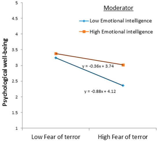 Graphical representation of the moderator emotional intelligence on the association between the fear of terror and psychological well-being.