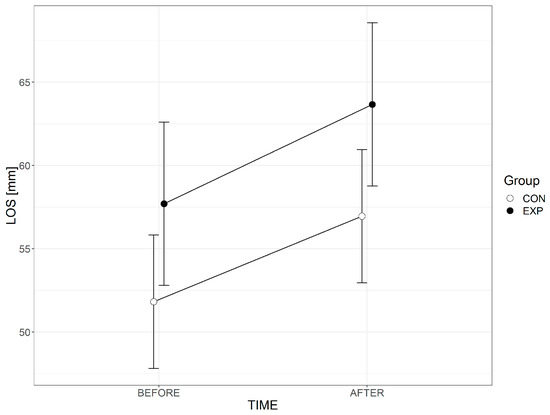 The results of the analysis of the LOS demonstrate statistically significant differences before and after the series of exercises in both groups (principal outcome TIME: F(1.42) = 6.337, p = 0.002). The interaction of the variables TIMExGROUP did not indicate statistically significant differences. Table 3 contains the mean values and standard deviations of LOS values for both groups. The data in Figure 1, on the other hand, demonstrates an increase in the mean LOS values following the exercise program with regard to both subjects’ eyes open and closed.