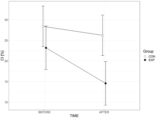 The analysis of the CI parameter does not demonstrate significant differences measured in terms of the principal outcome represented by the duration of the exercise (F(1.42) = 3.501, p = 0.069). Both groups demonstrate a decrease in the level of muscle coactivation following the exercise program. The remaining effects do not show statistically significant results. Table 4 contains the mean values and standard deviations of the CI parameter for both groups. The results in Figure 2 demonstrate that the mean values of CI following the exercise program have decreased. We can note that the subjects in the experimental group show greater falls; however, they do not assume statistically significant values in comparison to the control group.