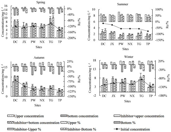 Concentrations of TN in the upper and bottom layers changed significantly after incubation (Figure 3). Compared to initial TN concentrations, upper TN concentrations decreased and bottom concentrations increased in spring, autumn and winter, while both upper and bottom TN concentrations decreased in summer compared to initial TN concentrations. This general pattern was observed across all treatments and sites, although rates of change differed among treatments, sites and seasons. Percentage changes in TN concentrations were 6.41–79.19% for control upper water, −44.94–60.47% for control bottom water, 7.02–61.26% for inhibitor-treated upper water and −43.92–48.93% for inhibitor-treated bottom water. TN reduced from the upper layer was transferred to the bottom layer in both treatments in spring, autumn and winter, suggesting that sedimentation of suspended solids was the primary TN reduce process in these seasons. Summer results suggested that microbial activity played an important role in TN reduction.