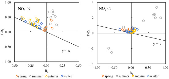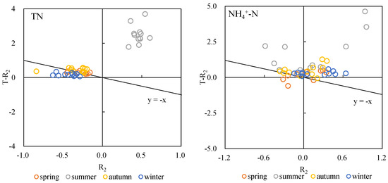 A scatterplot of the theoretical vs. measured rate of change for the bottom layer shows that most spring, autumn and winter data points are distributed in quadrant II, close to the y = −x line, while summer data points are located in quadrant I (Figure 4). These results indicate that sedimentation was the main TN reduction process in spring, autumn and winter, while microbial activity contributed significantly in summer.
