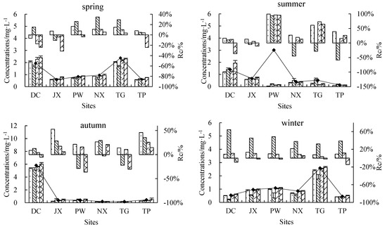 TN, NH4+-N, NO3−-N and NO2−-N reduction rates in the sampled rivers in different seasons (mg·(m3·d)−1).