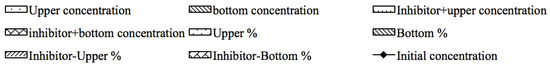 Initial NO2−-N concentrations (line), final upper- and bottom-layer NO2−-N concentrations (lower histogram) and percent change from initial NO2−-N concentrations (upper histogram). A negative percentage indicates an increase in concentrations and vice versa.