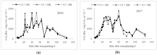 Under different biochar applications, the regulation of CO2 emissions from paddy fields under water-saving irrigation was generally consistent, and no significant difference was observed between the 2016 and 2017 data (Figure 1). The CO2 emission fluxes continued to increase before 24 DAT (date after transplanting) and remained at relatively high levels during 24–60 DAT in 2016 and 24–63 DAT in 2017, and then gradually decreased. Applying moderate amounts of biochar reduced CO2 emissions in the paddy fields, whereas high contents of biomass biochar promoted CO2 emissions, which may be due to the upper limit of carbon sequestration function of biochar [14]. The average CO2 emission fluxes in 2016 were 882.74 mg m−2 h−1 for CI + MB and 1006.19 mg m−2 h−1 for CI + HB, which were 2.98% lower and 10.59% higher than those of CI + NB, respectively. Meanwhile, the fluxes in 2017 of CI + MB and CI + HB were 6.62% lower and 9.89% higher than those of CI + NB, respectively. The patterns of CO2 emissions have multimodal features. Majority of the CO2 emissions were observed in the early growth stage, and the peak fluxes were nearly the same time for different treatments. The first peak of CO2 emissions occurred in all three treatments of CI + NB, CI + MB, and CI + HB during the tillering stage. The peak value of CO2 emissions of CI + MB and CI + HB in 2016 were 1941.27 mg m−2 h−1 and 2581.57 mg m−2 h−1, a decrease by 24.64% and an increase by 0.22% compared with those of CI + NB, respectively. In 2017, the emission peaks of CI + MB and CI + HB were 2185.7 mg m−2 h−1 and 2771.49 mg m−2 h−1, which were 2.96% lower and 23.04% higher than those of CI + NB, respectively.