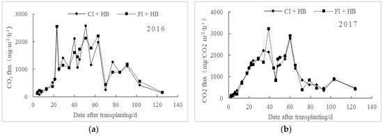 No significant difference exists between the regulations of soil CO2 emissions under different irrigation treatments, which keep the same upward and downward trend (Figure 2). The CO2 emission fluxes of flooding irrigation treatment (FI + HB) were higher than those of controlled irrigation (CI + HB), which may be related to the increase of soil dissolved organic carbon (DOC) content, substrate and microorganism activities, and acceleration of soil mineralization under flooding irrigation. The mean CO2 emission fluxes of water-saving irrigation paddies (CI + HB) were 1006.19 mg·m−2·h−1 in 2016 and 1156.81 mg·m−2·h−1 in 2017, which were 2.07% and 2.22% lower than those of FI + HB, respectively. These findings may be attributed to different fertilization treatments and climate conditions between the two study years.