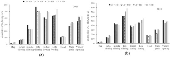 The CO2 emission fluxes at different growth stages of paddy fields under different biochar applications are shown in Figure 3. No significant difference was observed between 2016 and 2017. Compared with the contrast treatment (CI + NB), the moderate amount of biochar application (CI + MB) inhibited CO2 emissions, while the high amount of biochar application (CI + HB) promoted CO2 emissions. The general trend can be described as an increase after transplanting, maintained at the high level during the middle tillering stage until the jointing and booting stage, and then a gradual decrease. The CO2 emissions from paddy fields were mainly concentrated in the middle tillering stage, late tillering stage, and jointing and booting stage. The main peaks appeared in the late tillering stage, which may be related to the water management in the field. Soil moisture was saturated in the initial and middle stages of tillering. Moreover, rainfall in the heading flowering period was not conducive to CO2 emissions. As a result, the CO2 emissions were concentrated in the middle-tillering stage until the booting stage. The cumulative CO2 emissions of the milk grain stage and the yellow ripening stage were relatively large, and they were mainly related to the long duration of the two phases. The duration of the milk grain stage and the yellow ripening stage reached 19 days and 31 days, respectively.
