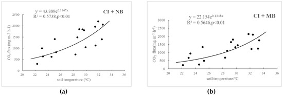 where F is the CO2 emission flux (mg m−2 h−1); T is either soil temperature or air temperature; a is the CO2 emission flux (mg m−2 h−1) at 0 °C; and b is the temperature reaction coefficient.