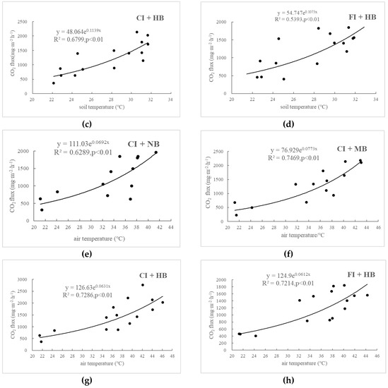 Effects of soil temperature on CO2 emissions in CI + NB (a), CI + MB (b), CI + HB (c), FI + HB (d) and relationship between CO2 emissions and air temperature in CI + NB (e), CI + MB (f), CI + HB (g), and FI + HB (h).