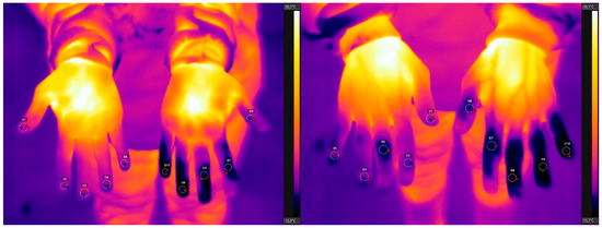 In these conditions, ISO 11079 Ergonomics of the thermal environment [10] institutes that finger temperatures ≤24 °C cause low physiological strain and ≤15 °C is considered high physiological strain. To detect thermal anomalies characterized by increasing or decreasing the temperature on the surface of the skin, some authors recommend the use of thermography because it is a non-invasive [11] and non-radiating tool [12]. Thermography has been used in studies related to occupational health, assisting in the diagnosis of musculoskeletal disorders [13], assessing the return to work [14], and analyzing the hand temperatures of office workers [15] and exposure to the cold environment [16,17].