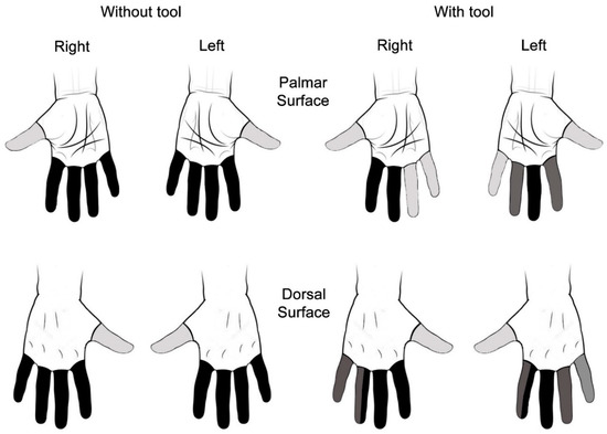 Studies agree with our findings regarding the group that did not use a tool [17,37], where the little finger had lower temperatures between the fingers of each hand on both surfaces, and the thumb was the hottest finger in all conditions analyzed.