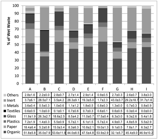 The average composition of the OFMSW directed for biological treatment in the plants used in the study was varied. The lowest organic content was found in the OFMSW directed for stabilization to containers, where column G reached 32.1%, as illustrated in Figure 1, and the OFMSW for thermophilic fermentation, where column B reached 35%. The organic content share in the other wastes ranged from 42.5 to 53.9%.