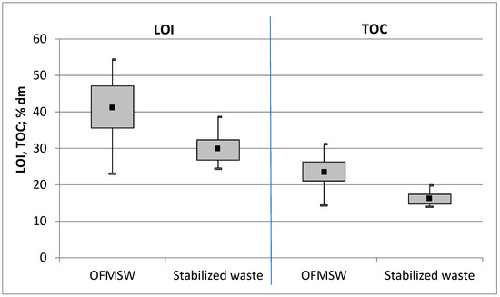 The range of the loss on ignition (LOI) and total organic carbon (TOC) parameters (% DM (dry matter)) obtained for 20 different waste samples from Polish mechanical–biological treatment (MBT) plants. The diagram includes the median, minimum, and maximum values, as well as the 25% and 75% quartiles.